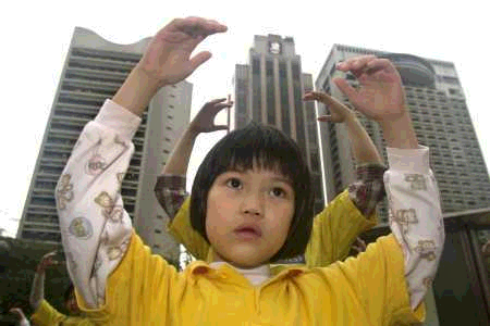 2.美联社4月25日星期三图片报导,一位小法轮功追随者4月25日与此团体数十个成员一起在香港炼功以纪念在中国被禁的法轮功精神团体中南海请愿两周年。美联社/Anat Givon。
