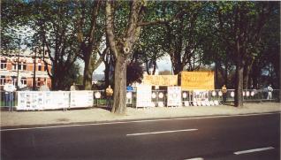 【明慧网2001年4月28日】 四月二十五日下午,比利时的大法弟子相约来到中国大使馆前,纪念两年前的今天,为人类历史写下光辉一页的4.25――万名大法弟子和平上访。弟子们有序地布置着场地,为了这次活动,几位学员特意赶制了两块展板,纪念被江泽民犯罪集团迫害致死的190多位国内同修,其他国家的学员还专程送来了精制的花环,面对使馆,我们拉开了横幅,依次展开了介绍大法及揭露迫害真相的海报。