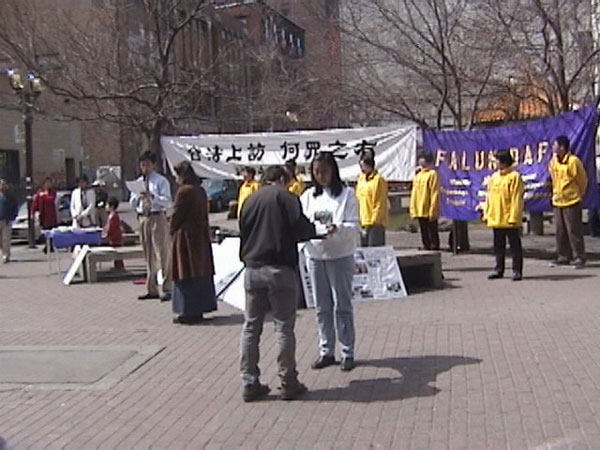 整个活动于下午6时许结束。其中来往中、西行人驻足观看展板,纷纷在呼吁信上签名,索取大法资料。