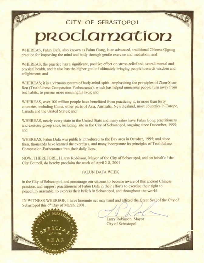【明慧网2001年4月3日】 加州赛巴斯特波尔市(City of Sebastopol, California)宣布2001年4月2日至8日为“法轮大法周”