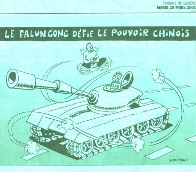 (日内瓦论坛报3月20日漫画,原标题为“法轮功不畏中国政权”。)