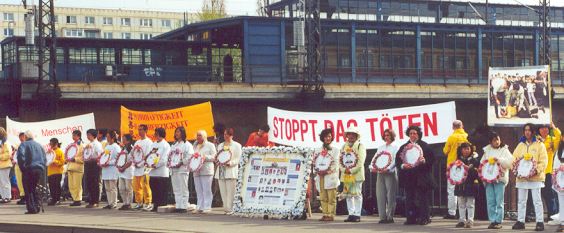 在柏林,二十五日上午学员们身着素色服装,在中国大使馆对面的大桥上手捧着纪念殉难者的花圈,静默站立,以纪念自中国镇压法轮功以来被迫害致死的学员并呼吁:中国停止镇压法轮功。学员们还举着一幅幅横幅标语:“法轮大法”,“停止虐杀”,“停止酷刑”以及数幅警察虐待学员的巨幅彩色照片。来往行人和车辆被这不同寻常的场面而感动,有的司机特意鸣喇叭示意支持。有个路人看完图片介绍后,流下了眼泪,并问:“我怎么样可以帮助你们?光流眼泪是没用的,我要做点什么。”