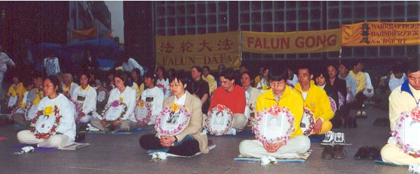 中午学员们在柏林进行了游行。这支队伍在喧闹的市区尤为引人注目。在游行队伍的最前段,两位西人学员庄严地抬着一块围着花环的纪念死难者的大幅图片。紧接着是小弟子们抬着花圈缓缓地走在队伍前排。在队伍中,学员们举着横幅和图片,在“普度”和“济世”的音乐声中,游行队伍缓缓地行进在柏林的中心大街上,气氛异常肃穆庄严。路人被这支宁静的队伍强烈吸引住了。两位从法国来的游客在路旁竖起大拇指对学员说:“法轮功好!”有的开车人专门停下车来向学员要资料。无数行人在街边驻足观看并十分乐意接受学员发的资料。有的主动走向学员来了解真象并表示他们理解和支持学员的行为。