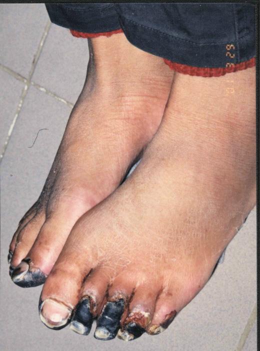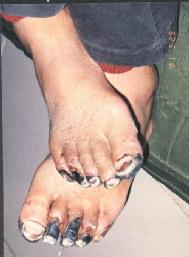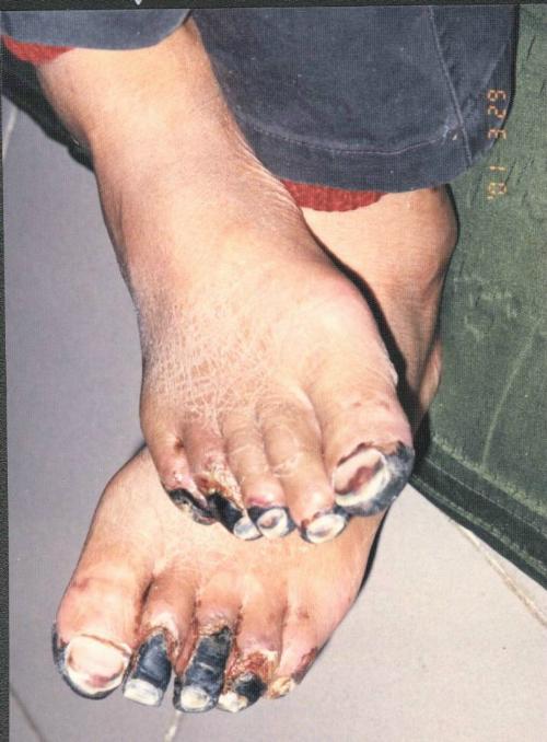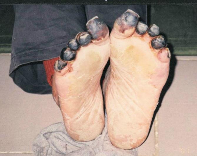 第十三天时,我发现我的十个脚趾全发黑。医疗室大夫连夜送到电力总医院,强制输液,有一种是黄颜色的。第二天,主治大夫说要全部截趾。看守所的人怕担责任,忙找来双拐,四六特号拖鞋(当时脚肿大),把我抬送到开往保定的车上就不管了,临走时,还特别叮嘱不要对外讲是他们害的。