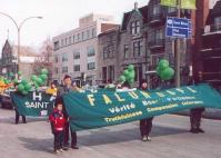 考虑到圣帕特里克日的特点,学员们制作了绿色调为主的大法横幅,定做了数百个印有英文“法轮大法”、“真、善、忍”的绿色气球。