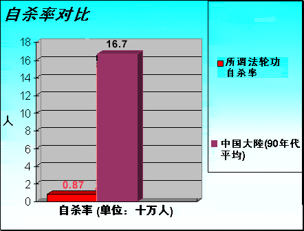 | 江泽民一伙声称,七年间“法轮功自杀者”有136人,平均每年将近20人。假设如此,所谓的法轮功自杀率便是0.87(以十万人为单位)。世界卫生组织(WHO, 1989)提供的中国每年自杀率是17.1,专家估计实际还会更高,达25;而哈佛公共卫生学院做的一项研究更是认为大陆的自杀率达30。南方周末出版社出版的《真相》(1999年)一书中披露,专家估算,1990年至1994年,中国农村平均每年自杀死亡人数为303047人(第354页)。这只是说农村,还没包括城市。假如平均每年有20万人自杀,则中国的自杀率是十万分之十六点七(以总人口12亿计),即16.7。(数据来源:美国百科全书; 台湾:世界日报) |