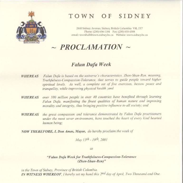 【明慧网2001年4月9日】 加拿大不列颠哥伦比亚省悉尼镇宣布2001年5月13日至19日为“法轮大法真善忍周”。
