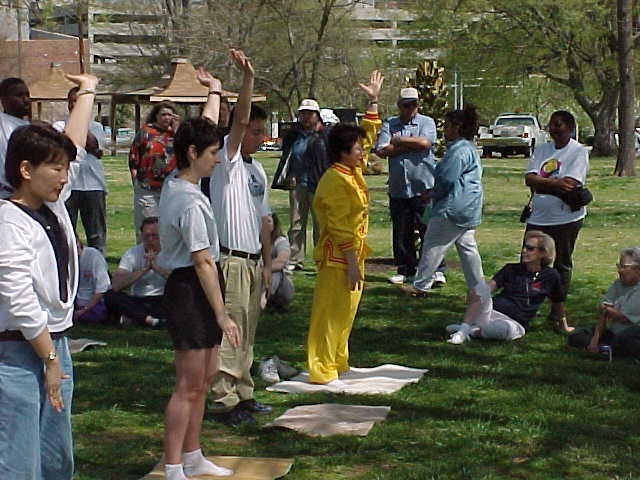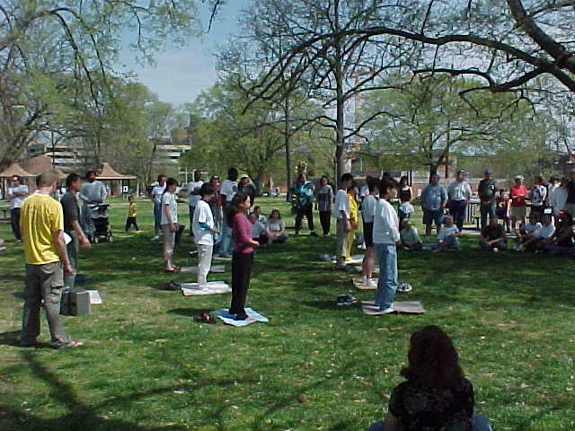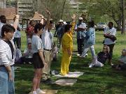 四月七日周六,来自田纳西州的十几名大法弟子应邀参加了纳什维尔市的世界太极气功日。这一天风和日暖, 纳什维尔市的近百名太极气功爱好者聚集在市内的 Dragon Park。大法弟子们在祥和的法轮练功音乐中表演了优美的五套功法。西人学员尼克(Nick)首先介绍了法轮大法的修练方法, 然后在学员表演过程中又一一讲解了每套功法的特点。 学员在公园内摆放了七、八块法轮大法宣传展板和揭露江泽民政府残酷