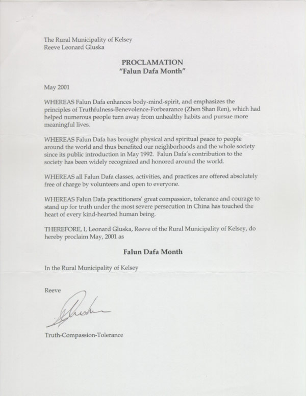 【明慧网2001年5月11日】加拿大马尼托巴省凯西镇宣布2001年5月为"法轮大法月"。