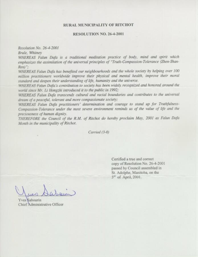 【明慧网2001年5月12日】加拿大马尼托巴省瑞驰渥特市宣布2001年5月为“法轮大法月”。