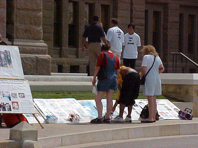于五月十日星期四凌晨,休士顿大法弟子开车前往德州的州府奥斯汀,与达拉斯、圣安东尼以及当地大法弟子汇合一起在州议院前洪法。从上午九点开始,在州议院前摆满了各种横幅,如:中英文字法轮大法真、善、忍;彩色法轮图型金光闪闪。以及其他字,如:中国:停止镇压法轮功。中国法轮功学员被迫害的图片与各种洪法资料等。一位中年美国人一见到大法弟子身上的黄T恤的字:法轮大法,真、善、忍,马上要求一件黄T恤,他说:我最喜欢真、善、忍这三个字的含义,您们一定要满足我的要求。一位大法弟子将身上的黄T恤给了他,他立即穿上满意而去,不一会儿,他与他妻子同来观看洪法图片。这天来州议院观览的游客很多,也有些是来州议院办理公务的人员,也有个别团体来州议院前举着牌子、边走边喊口号表达他们的意见,让警察处于紧张状态。而大法弟子则在州议院前静静地炼功,非常宁静祥和,由此却引起游客,办事人员的高度注意,纷纷来到炼功队伍前,主动索取大法资料,并且询问一些问题。有些一直在观看炼功,个别的还模仿着炼功动作。有些读着横幅上的字,有些拍下或录下大法弟子炼功镜头,一位青年美国人竖着大拇指,敬佩地对大法弟子说:法轮大法。警察对大法弟子微笑着。