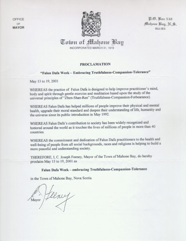 加拿大诺瓦斯堪地亚省玛鸿湾镇宣布“法轮大法真善忍周” 【明慧网】