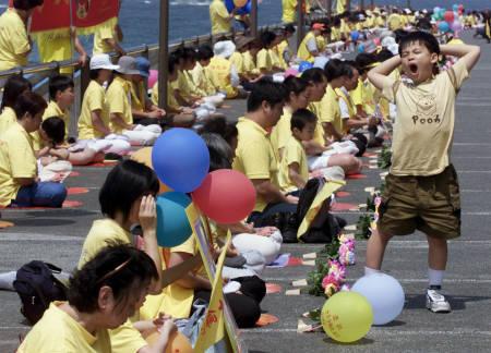 图片一:5月13日,星期日,香港法轮功成员打坐炼功纪念世界法轮大法日。大约300名该精神运动的追随者在香港特区举行了户外炼功活动,纪念此运动创立九周年。(路透社/伯比叶)