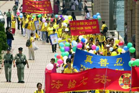 图片二:5月13日星期日,法轮功精神运动的追随者们沿市中心的一条街道游行。大约300名法轮功追随者在这块中国领土上公开纪念第二个法轮大法日。(美联社照片/文森特)