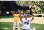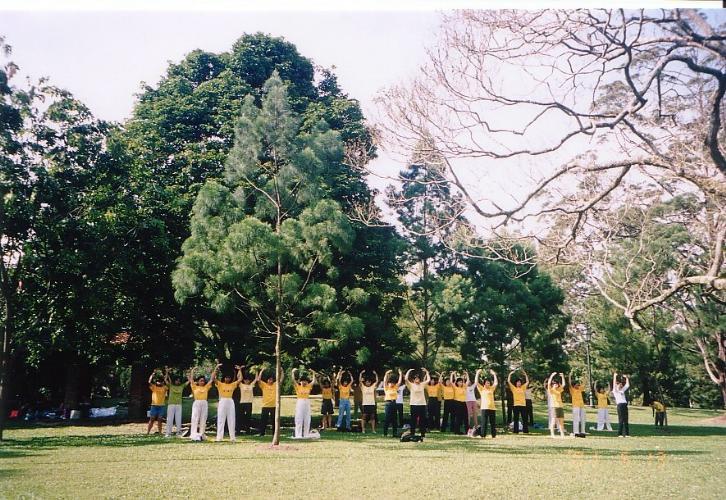 【明慧网2001年5月15日】五月十三日的新加坡。清晨学员们分散在全岛多个地方炼功,并身着印有大法字样的衣服走街串巷,以期民众通过与学员的当面接触对大法有更多了解。下午,学员们在新加坡植物园集体炼功。虽然不能够摆放大法简介,学员们各式各样的大法服装包含了各种信息:法轮大法在世界各地,炼功图片,大法简介,或短而有力的语句,如“法轮大法是正法”;同时展示了大法的美好。集体炼功结束,学员们三三俩俩步行在新加坡最繁华地带。新加坡学员以向世人洪法这种方式,庆祝师尊传法大法九周年并庆祝世界法轮大法日。