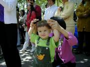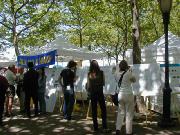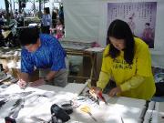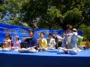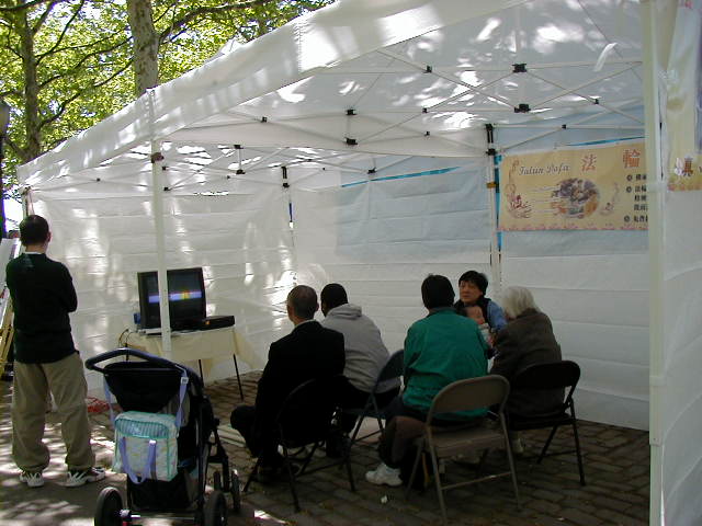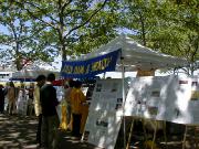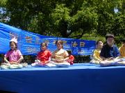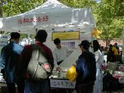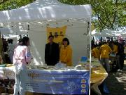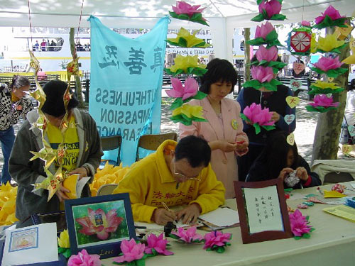 游人有的观看介绍法轮大法的图片,有的选取纪念礼品,也有的请学员给他们画像,还有的兴致勃勃地跟着学员学习中国舞蹈。人们发现原来法轮功和我们每一个人是靠得那么近,那么易于了解,易于接受,和中国政府宣传的根本就不是一回事。最热闹的还数设在草地上的教功摊位,从一开始就不断有人来学功,一直到活动结束,人数多时有十多人同时在学。是啊,为什么不呢?只要静下心来学,很快就会体验到法轮功! 对于身心健康的益处。一位热心的记者感叹地说:“你们真应该举办这样的活动啊!让人们看到你们和普通人是多么融洽。” 有位从大陆来的游客亲切地同大法弟子交谈,他虽不修炼,但深知大法好,他的亲人因修炼大法就被江泽民的爪牙们无罪关押,不让同家人见面,这位被抓的大法弟子异常坚定,对亲人表示决不放弃大法修炼。他对江氏为维护自己私利,从而镇压法轮功的卑鄙做法看得一清二楚。不少大陆来的人士接过了真相资料,还有的询问自焚是怎么回事,学员们的回答使他们茅塞顿开。