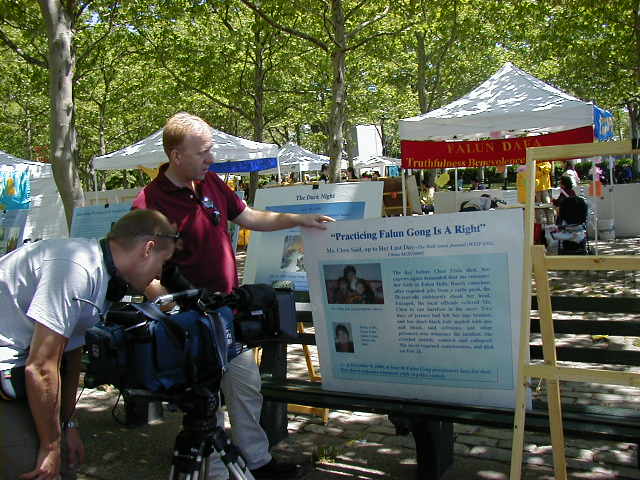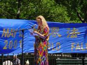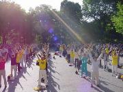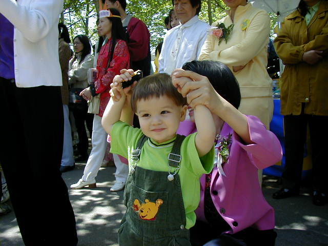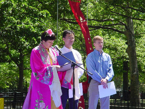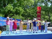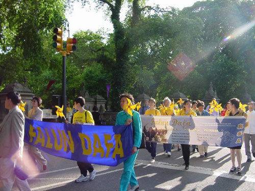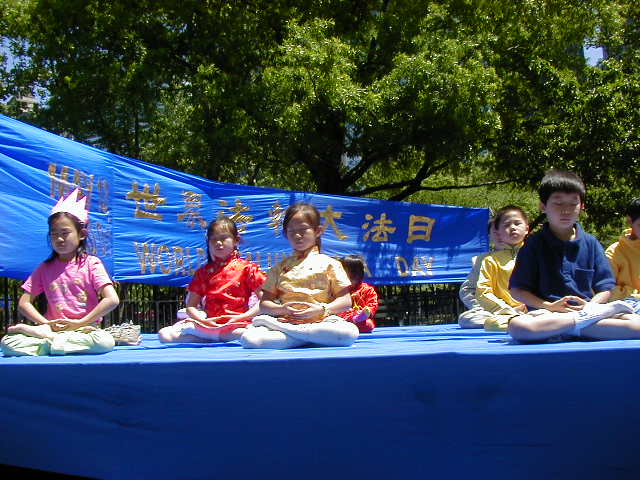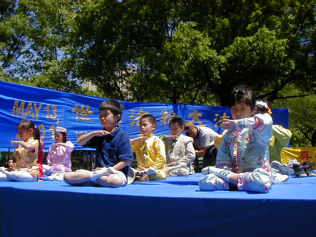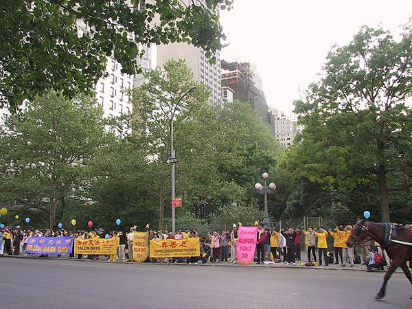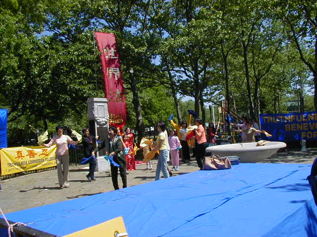 首先我们在大广场上齐齐排好,做功法演示。西人学员为这次的世界法轮大法日致词,他说,今天, 我们在纽约庆祝第二届世界法轮大法日,还有四十多个国家的大法弟子在这一天同时庆祝,包括中国大陆的弟子,他们在放弃一切中仍坚定地维护着自己修炼法轮大法“真,善,忍”的权利。法轮大法吸引了各个国家,各个种族,各个阶层的人,无论在身体还是心灵上,他们都极大受益。而这种遵循了宇宙特性“真,善,忍”的高德大法在中国却被江泽民政府残酷镇压,数万人,不分男女老幼,由于不肯放弃法轮大法,被关押,酷刑折磨,两百多人被迫害致死,然而直到今天,他们仍然一如既往地以无比的勇气,用非暴力的方式坚定着自己的信仰。他们的勇气和力量打动了全世界有正义感的人民和政府。