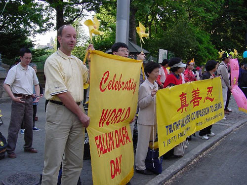 师父传法九周年及第二届世界法轮大法日,世界各地的大法弟子都沉浸在节日气氛中。这一天,纽约晴空万里,草绿花香,普天同庆,天地同向!
