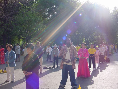 四周游客细心地聆听,静静地观看,是啊,眼前一张张详和善良的面孔,舒缓优美的炼功动作,生活在自由国度的人怎么能够相信那种惨无人道的暴行。