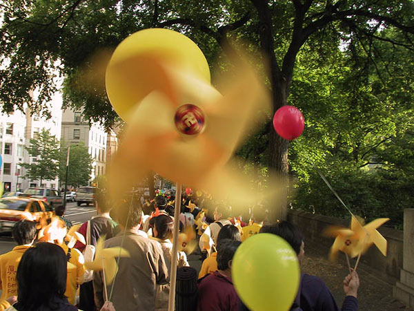 游行开始了,在普度的音乐声中,队伍缓缓前行,弟子们身着盛装,节日的笑容洋溢在脸上,更有不少式样各异,色彩绚丽的古装,吒紫嫣红,点缀其中。人人手中金黄色的风车,象盛开的一朵朵旋转的花,中心的法轮图形,在夕阳中煞是明亮。空中的彩色气球,把整个队伍衬托的恰似移动的花海。