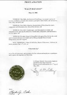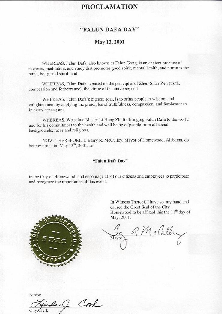 【明慧网2001年5月15日】阿拉巴马州厚姆伍德市宣布2001年5月13日为“法轮大法日”