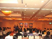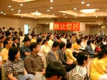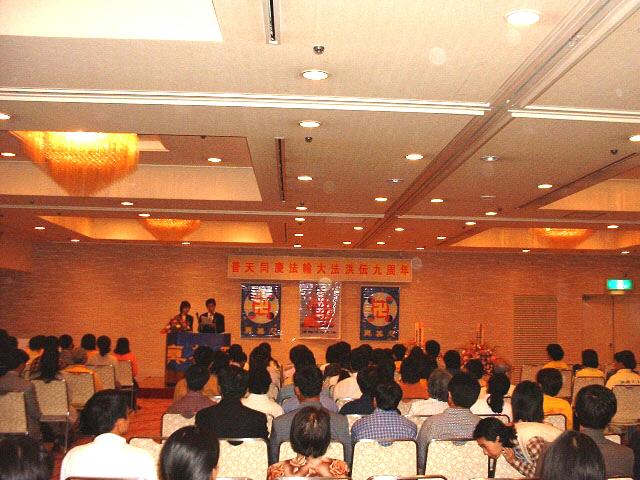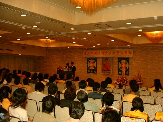 炼功完毕,大家来到板桥区文化会馆,召开庆祝交流会。会场上悬挂着师父的法像和大法轮图形,前台摆满鲜花,普度、济世的音乐回响着,全场洋溢着圆融祥和的气氛,同修们以日语、汉语朗读了庆贺的诗词及自己的修炼心得体会,很多同修冲破以往害怕写稿的框框,写诗赋词,自己朗诵自己的作品。同修们发自内心的朗诵和发言,充分体现了对大法的珍惜和对修炼的坚定,引来阵阵掌声,大家都感受到强烈的慈悲祥和的场,许多学员禁不住热泪流淌。