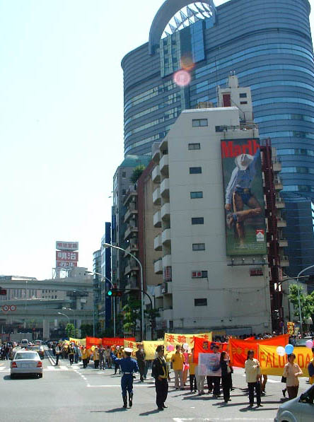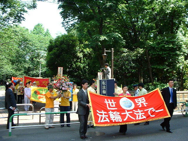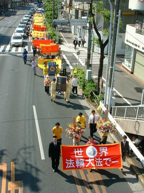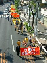 下午是庆祝游行。大家聚集在南池袋公园,整装出发。从这里开始经过行人如云的池袋繁华的街段,最后到达文京区区役所边公园。披着彩花贴着法轮大法字样及法轮标志的轿车在队伍前引导,一边行进一边播放着大法音乐,并由学员不断广播大法介绍,200多人的游行队伍浩浩荡荡,绵延100多米长,各地学员,还包括了很多至今从未走出来的学员,大家手持鲜花及各色印有“法轮大法”、“真善忍”的气球,面带笑容,大法的旗帜横幅迎风飘扬,场面壮观,充满节日气氛。一路上,吸引着众多行人驻足观看,大道两旁人行道上也有许多学员分发着大法报章和资料,其中不少是天真烂漫的小弟子。这次活动还吸引了不少媒体到现场拍摄采访。