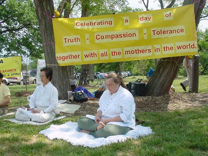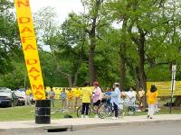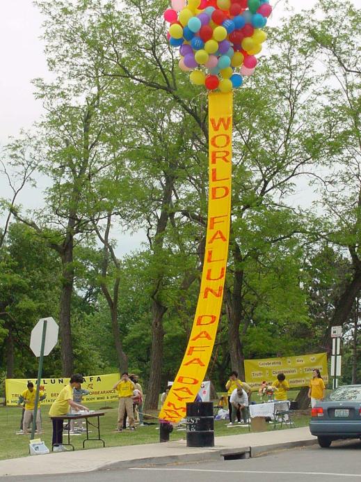 第二天是二零零一年五月十三日,世界法轮大法日。又恰逢母亲节,而我们在森林公园艺术博物馆(Art Museum)继续炼功弘法,长长的“世界法轮大法日”的条幅随风飘舞,大法的车队游行更使活动达到了高潮。