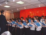 说明会场的节目,由三位大法弟子为世界法轮大法日所献上的「普度」小提琴三重奏拉开了序幕;其悲壮感人的乐声,让听者深深动容。再来是由三十多位大法弟子所组成的「真、善、忍合唱团」的演唱,演唱歌曲包括「母亲您真伟大」、「游子吟」等,不管是指挥还是伴奏,无论是二重唱还是四重唱,其超水准的演出令人惊叹,合唱完毕更频频让人高喊「安可」。