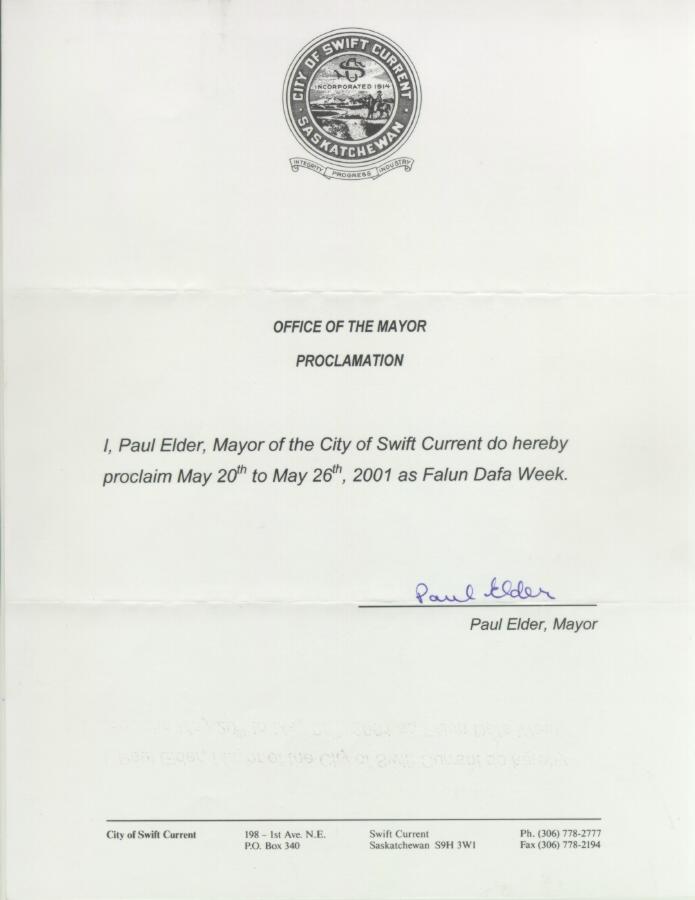 【明慧网2001年5月16日】加拿大萨斯喀彻温省急流市宣布2001年5月20日至5月26日为“法轮大法周”。