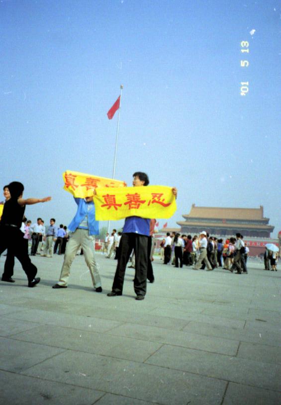 图片:天安门广场的法轮功横幅与警察暴力(5/13/2001)