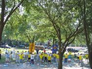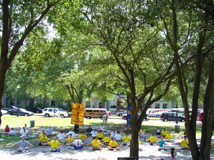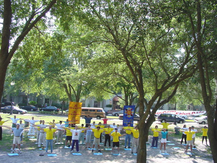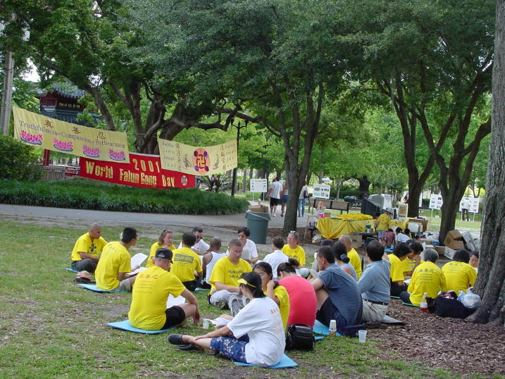 下午东西方学员一起学法,重点讨论了怎样"站在法中认识法"和"以法为师"。同时我们还进行了一天的法轮功图片展览。八十多幅彩色照片向人们展示了法轮功的真实情况。图片的十个部分记述了法轮功在中国,美国,世界各地,佛州,奥兰多周边城市的洪传,法轮功学员的和平请愿等,图片还反映了法轮功在佛州各大学,和少年儿童中的弘法活动,以及佛州法会的情况。板报介绍中揭示了大量中国弟子被迫害的情况。