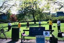 上午十点钟,我们照惯例先来到位于市中心的国王公园,进行集体炼功。学员们穿着黄色的大法T恤衫,在周围过往的行人及躺在草地上沐浴阳光的人们的注视下,炼起了舒展优美的五套功法。
