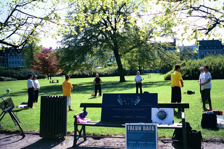 按照公园的规定,一般不允许放展板。今天的公园管理员恰恰是一位气功爱好者,他曾经多年对于自然的法则在进行探讨,对于修炼也有一定的了解。今天他按照事先的约定向我们借走了《法轮功》的书,当我们对他解释今天这个特殊的日子,因而有这么多展板时,他欣然同意了。