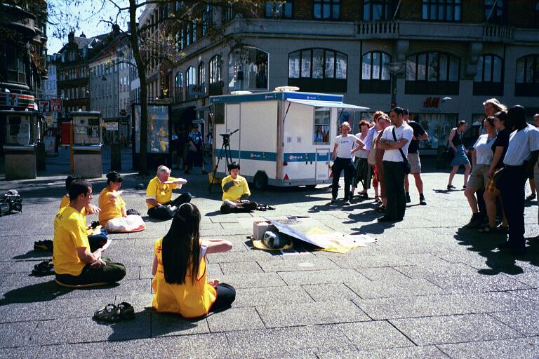 下午一时,我们来到闹市区的步行街上的KULTORVET小广场上,挂上大法横幅,世界大法日的标志,气球以及图片,一位学员带来了她经过多日绘制的漂亮的大法展板。还有一位母亲推着婴儿车,带着她出生才几个月的孩子,也赶来参加庆祝活动。