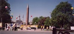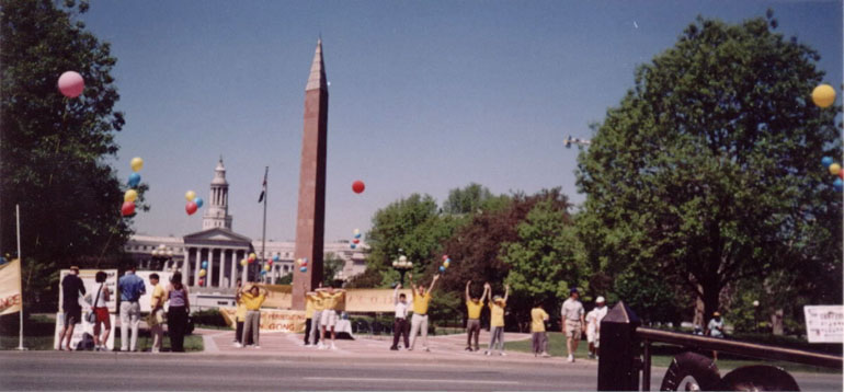今年五月十三日是第二届世界法轮大法日,标志着法轮大法弘传九周年。科洲法轮功学员于五月十二日,十三日分别在丹佛市州政府前面和华盛顿公园举行了世界法轮大法日庆祝活动。十二日星期六清晨在州政府前面的林肯公园,彩色气球飘扬在空中,来自科罗拉多春城和大丹佛地区的学员挂起了三幅黄底红字的英文大横幅:"法轮大法--真善忍","世界法轮大法日"和"中国:停止镇压法轮功"。在人行道的旁边,学员们还架起了图片展板,披露在中国大陆的法轮功学员遭受的残酷迫害。九时半至十一时,大部份学员静静地炼功,其他的学员给行人发真相资料,揭露江泽民犯罪集团对中国法轮功学员的残酷迫害。祥和炼功的场面令行人驻足观看,同时中国大陆法轮功学员所遭受的迫害令行人震惊,许多行人表示将以各种方式帮助制止江泽民犯罪集团的行为。一些过路司机鸣笛表示支持。在这期间,正好一个汽车游行活动在我们的旁边举行, 学员及时向观众展示五套功法,并将讲清真象的报纸送到了他们的手上。对很多人来说,这也许是他们与大法结缘的珍贵机会。