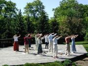 广场上摆放了讲清真象的展板,不少人驻足于此,认真地看着展板上的大法简介,和法轮大法洪传九周年为世人深深爱戴的大型炼功场面。一些西方人士及中国人和我们的学员学炼功法。