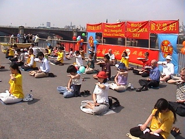 一天的洪法庆贺活动以在泰晤士河边炼功、发资料为主。学员的炼功场面吸引了无数游人的兴趣,尤其是炼静功时形成的强大、祥和的能量场令许多游人驻足观望、久久不愿离开。很多游人在仔细看了展桌上的洪法图片后,取走了“法轮大法、真善忍”的纪念章或书签,有的拿了“我支持法轮功”的纪念章。星期天的小游客也很多,他们欢天喜地地等着要印有中英文“法轮大法”的气球。