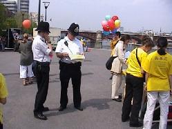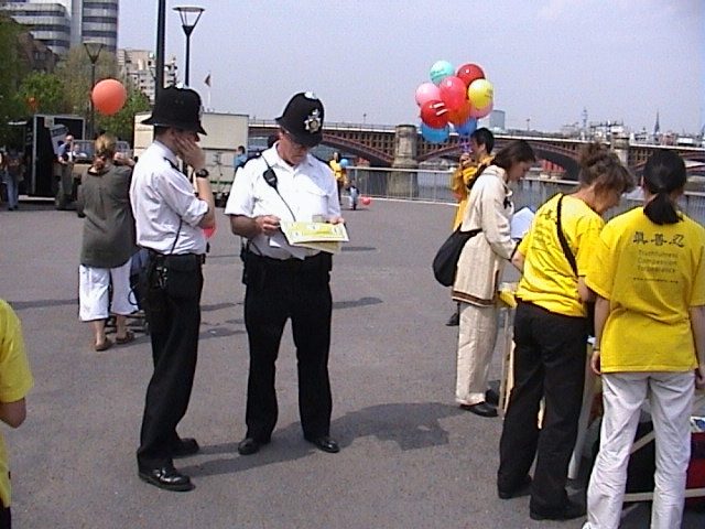 一整天的洪法活动结束了。在这个特殊的喜庆日子里,我们留给了世人什么呢?在泰晤士河边一直负责维持我们洪法活动的警察对学员说:“你们的活动是我们执行公务的所有活动中最文明、最平和的。”相信警察的这番评语道出了绝大多数世人的心声。另外一位警察,在观察了一整天之後,向弟子索要练功点的资料,因为他认为这个平和的功法可以帮助他。