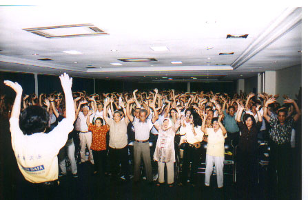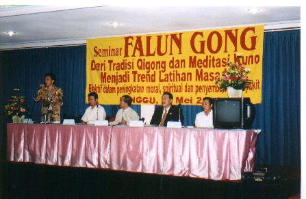 座谈会在雅加达SENAYAN体育馆举行,会堂正中挂着一面黄底红字横幅“古典打坐 传统气功 今成流行修炼”,这主题言词也在报刊登载了一天,吸引了社会民众400~500人蜂拥嘉临。来者包括电视台、媒体报社、商界人士、各种宗教信仰者、多种气功锻炼者,场面气氛十分祥和严肃。