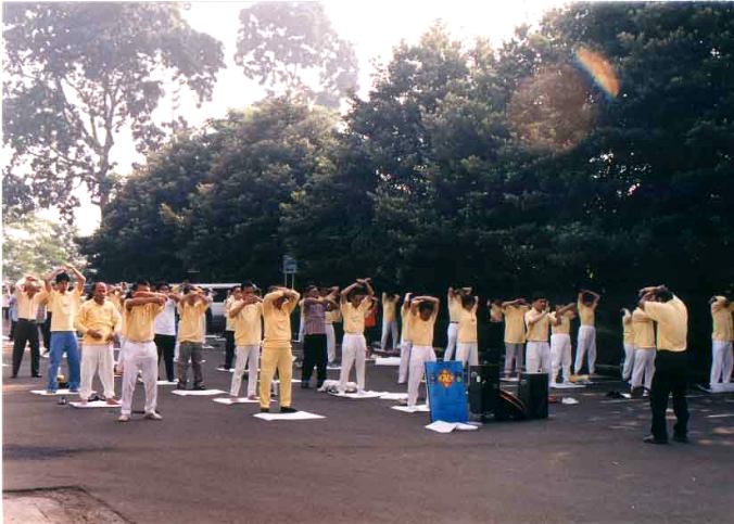 早晨7时30分,大约100名学员,身着上黄下白整齐制服集体炼功,在悠扬祥和音乐声中,五套功法轻松缓慢,悠悠起伏,吸引了许多路边观众也来参加炼功。