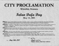 【明慧网2001年5月19日】蒙大拿州白鱼市宣布2001年5月13日为“法轮大法日”。