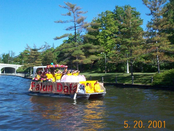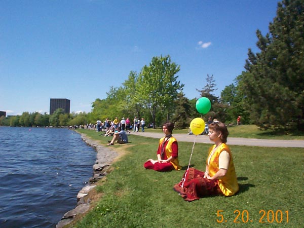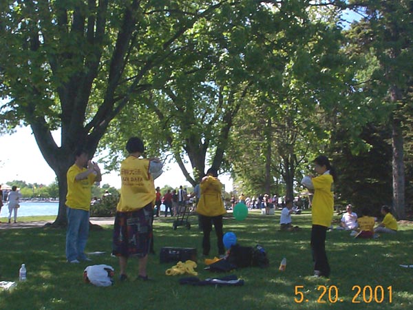 在公园附近,假日直通车车站对面草坪上的一幕,令人难以忘怀。一名来自滑铁卢的女学员,打着庄严神圣的手印,同时发出强大的正念之场。普度的乐声在空中久久回荡,在场的无数行人都看到了这感人至深的一幕。