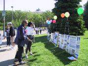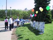 【明慧网2001年5月22日】五月十三日这天,匹兹堡风和日丽。学员们一早就来到杉纳丽公园,庆祝师父洪传大法九周年,庆祝第二届世界法轮大法日。这天正值附近举行一项大型活动,众多游客不时驻足观看学员炼功,并与学员交谈。将近三小时内逾千份大法的真相资料被游客欣然接受,这次活动取得了很好的洪法效果。
