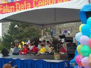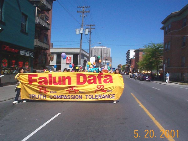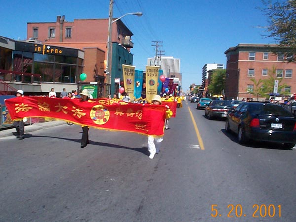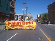 大约十点半,学员们开始从Confederation公园向中国城游行。走在队伍最前面的学员举着各种法轮大法横幅,接着是由二十七面由美国大法学员手工缝制的赤橙黄绿青蓝紫七彩旗队伍。在游行队伍的中间,学员们手里拿着各色印有“法轮大法”和“真善忍”的气球,队伍中间点缀着十八面由台湾学员制作的大型大法锦旗。在游行队伍两侧,学员们面向路人展开了“法轮大法”、“法轮大法在加拿大”、“法正人间”、“庆祝真善忍日”、“行动起来制止在中国的屠杀”等中英文横幅。游行队伍按加拿大育空省、安省、魁省、美国、欧洲、美国堪萨斯州、台湾、加拿大新科斯夏省、澳大利亚、加拿大阿尔伯特省、泰国、加拿大卑诗省和日本的顺序排列。
