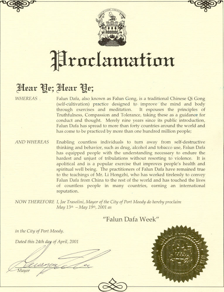 【明慧网2001年5月23日】加拿大不列颠哥伦比亚省波特莫地港市宣布2001年5月13-19日为“法轮大法周”。