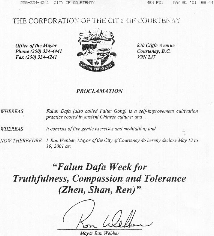 【明慧网2001年5月23日】加拿大不列颠哥伦比亚省科特尼市宣布2001年5月13-19日为“法轮大法真善忍周”。