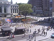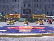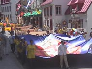 新闻发布会之后,约2点开始,学员们从议会大厦开始向游人如鲫的老城区游行。大法慈悲的《普度》声和祥和而又庄严的游行队伍,吸引了所有人的注意,人们微笑着接过大法的真相资料。长长的游行队伍最后聚集在著名的Youville广场,学员们又开始了炼功洪法。整齐排列的炼功队列后面,顺阶梯展开的巨型法轮图和高坡之上迎风飘扬的大法横幅,立即把热闹非凡的广场变成了神圣的洪法场。广场上和周围高地上的人群都静静地看着,沐浴在大法的慈悲里。