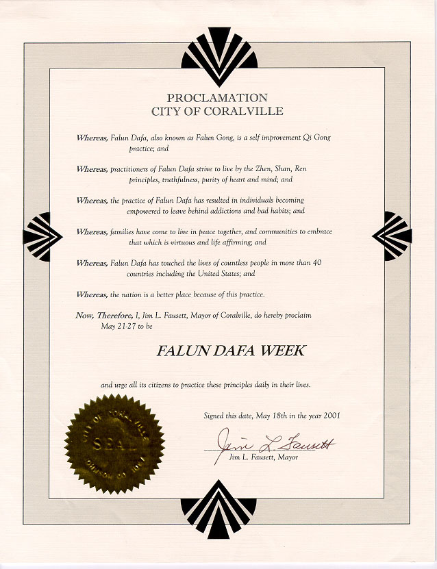 【明慧网2001年5月27日】爱荷华州克罗维尔市宣布2001年5月21日-27日为“法轮大法周”。