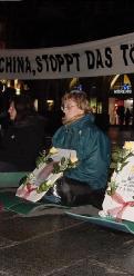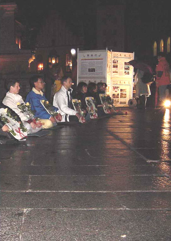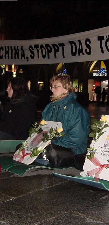 慕尼黑市政厅提供给我们电源,我们接上了探照灯,打在宣传板及横幅标语上,在夜幕中显得格外醒目,吸引了许多路人驻足观看,江泽民一伙的暴行又一次暴露在聚光灯下。